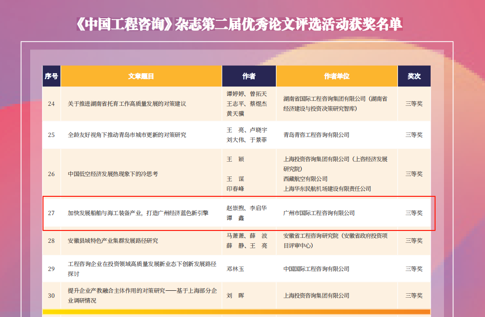 廣州國際咨詢公司榮獲《中國工程咨詢》雜志第二屆優(yōu)秀論文獎(jiǎng)